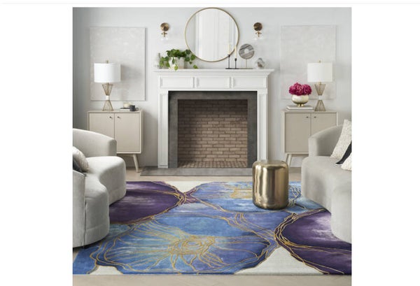 Designed to captivate, the Haebao rug brings charismatic color and daringly dimensional texture to the modern home. Expertly hand-tufted from the finest wool interwoven with silk-like fibers, this contemporary rug blends distinctive style and lasting comfort exquisitely. Create an elegant foundation for your decor with this abstract rug. Pools of blue and purple are outlined with subtly carved, abstract gold lines that form a richly toned floral pattern. This rug is ideal as a focal point for your living room or bedroom furnishings. For maintenance, vacuum regularly (no beater bar).