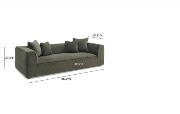 Bold and stylish, the Tuliptime green sofa is a sleek yet formidable addition to your living room. Deep and highly cushioned, this European silhouette is modified for comfort and comes with heavy accent pillows of ethical synthetic down fibers. Lined with contrasted piping and four accent pillows, the mixture of materials here is one of the hottest trends. Amazing in the middle of the room or against a corner, this 360-degree beauty is a showstopper from any angle. Every face is rounded and padded and covered in high density foam. Customer assembly is required.